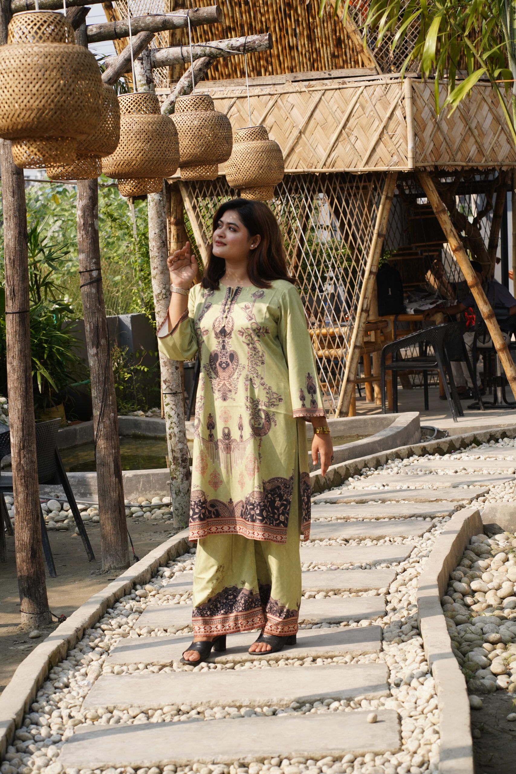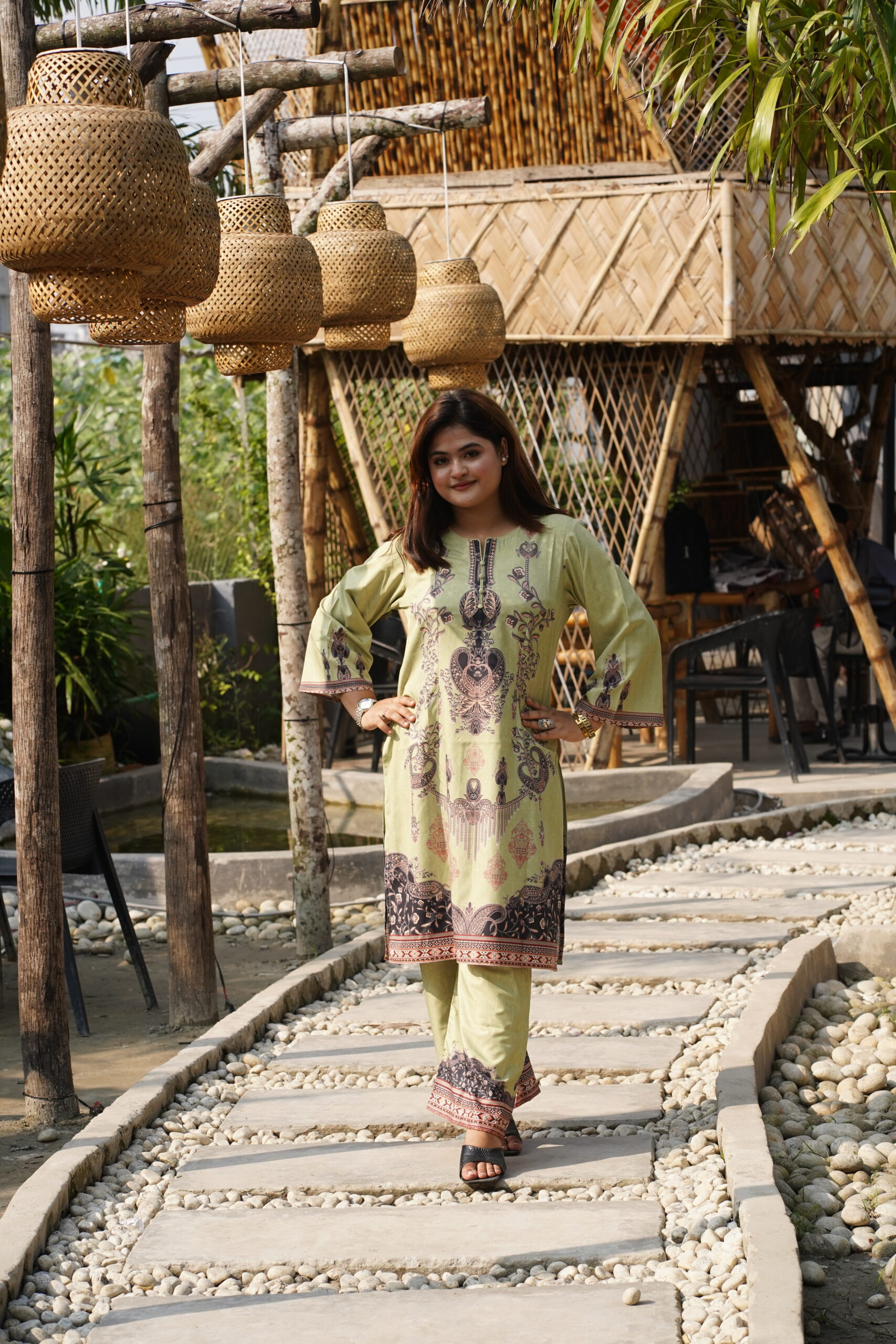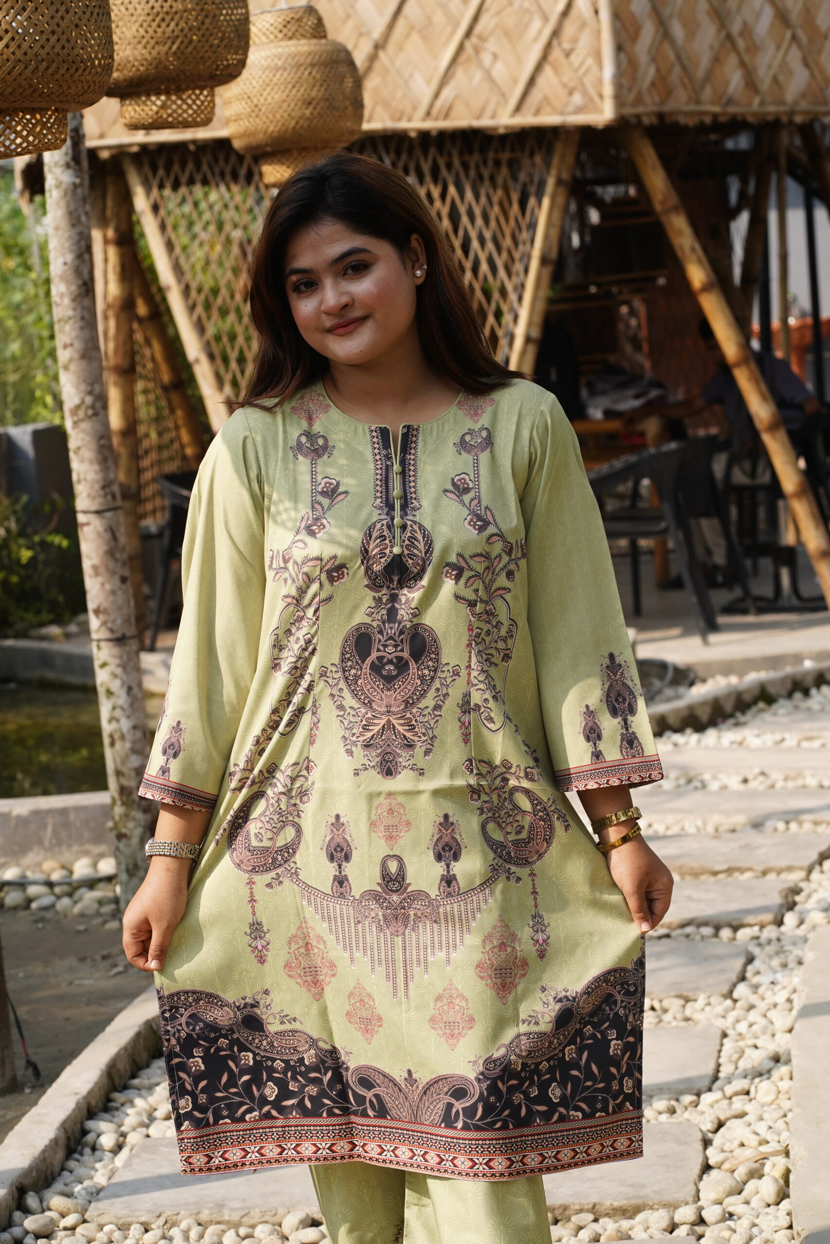 স্টাইলিশ কাটিং ও চমৎকার প্রিন্ট এর উপর কট পাইপিং এর সাথে আমরা বেবহার করেছি কাবার বাটন,,,